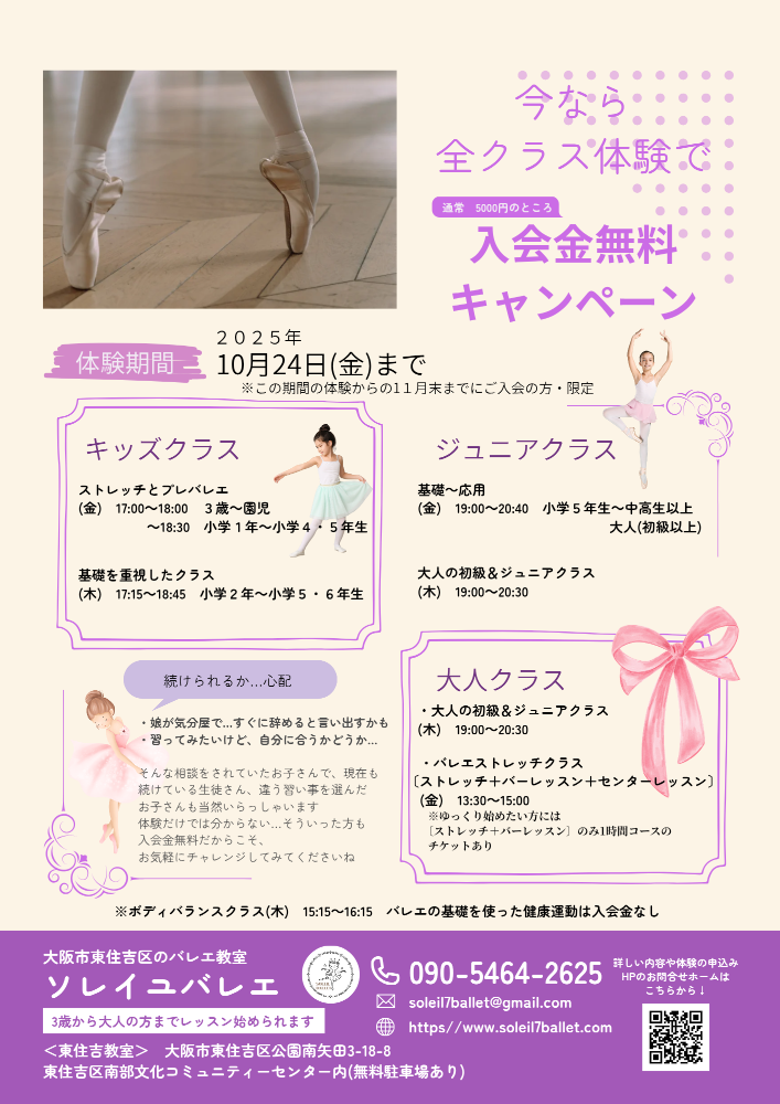 体験レッスンを受講された方がご入会いただける場合は通常 5000円の入会金を無料とさせていただきます